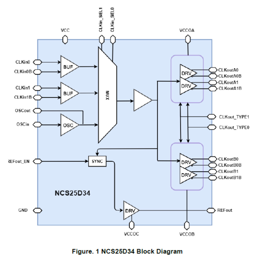 The NCS25D34 is a highly versatile, high-performance, 4-output differential fanout buffer and level translator which can operate up to 3.1GHz with ultra-low additive jitter.